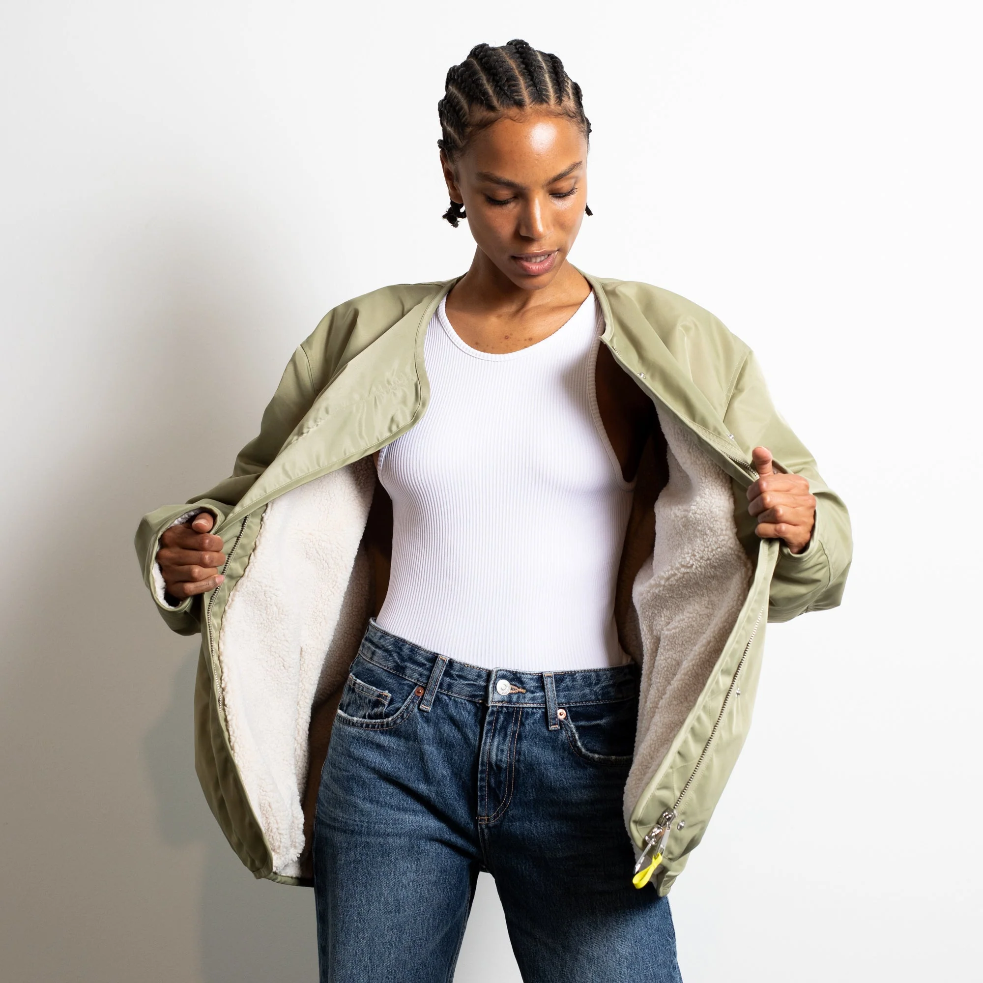 Der Schnitt der Jacke in sehr oversized Passform ist länger als bei anderen Bomber Jacken, reicht über die Hüfte und schmeichelt der Figur. Dank des beidseitig nutzbaren Zwei-Wege-Reißverschlusses und der Druckknopf-Leiste kann die Jacke - ideal auf dem Fahrrad - auch von unten geöffnet getragen werden. Unsere Bomber Jacket Collection kommt in zwei Größen, passt unterschiedlichen Figurtypen und wird aus recycelten Materialien gefertigt.